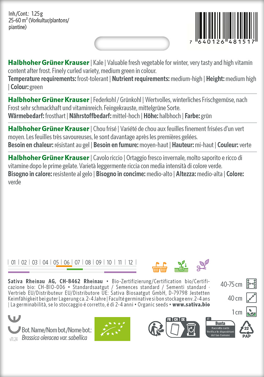 Grünkohl 'Halbhoher Grüner Krauser', Federkohl BIO Samen