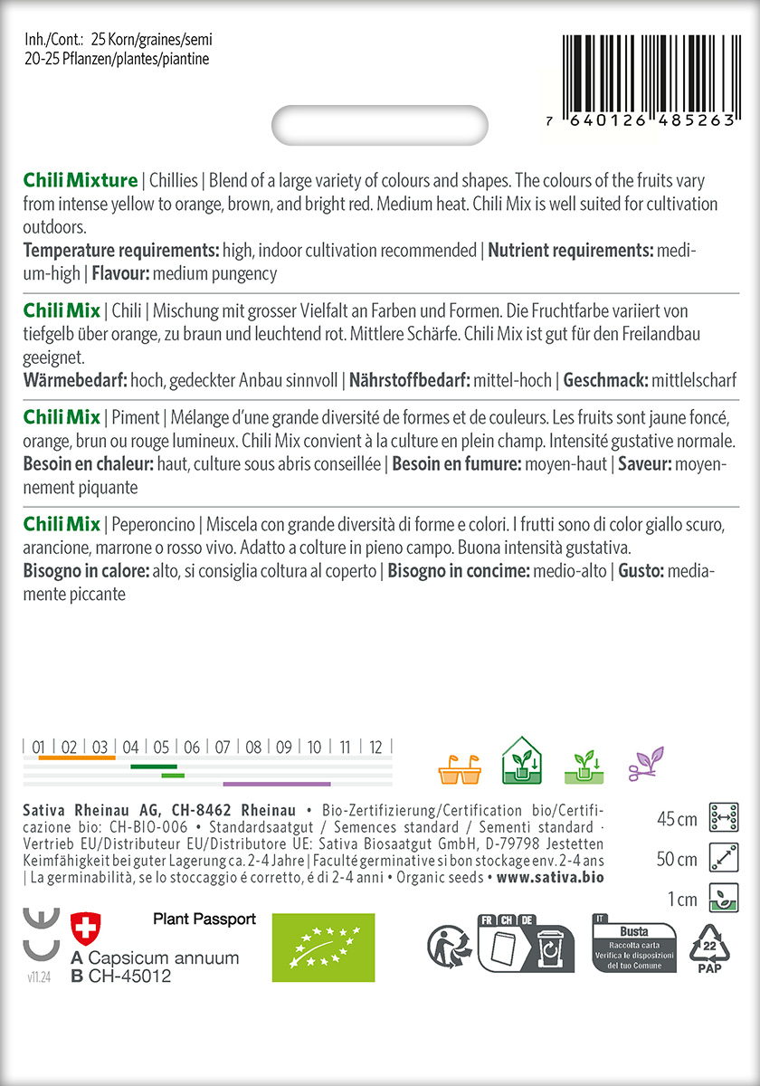Mittlere Schärfe. Chili Mix ist gut für den Freilandbau geeignet.